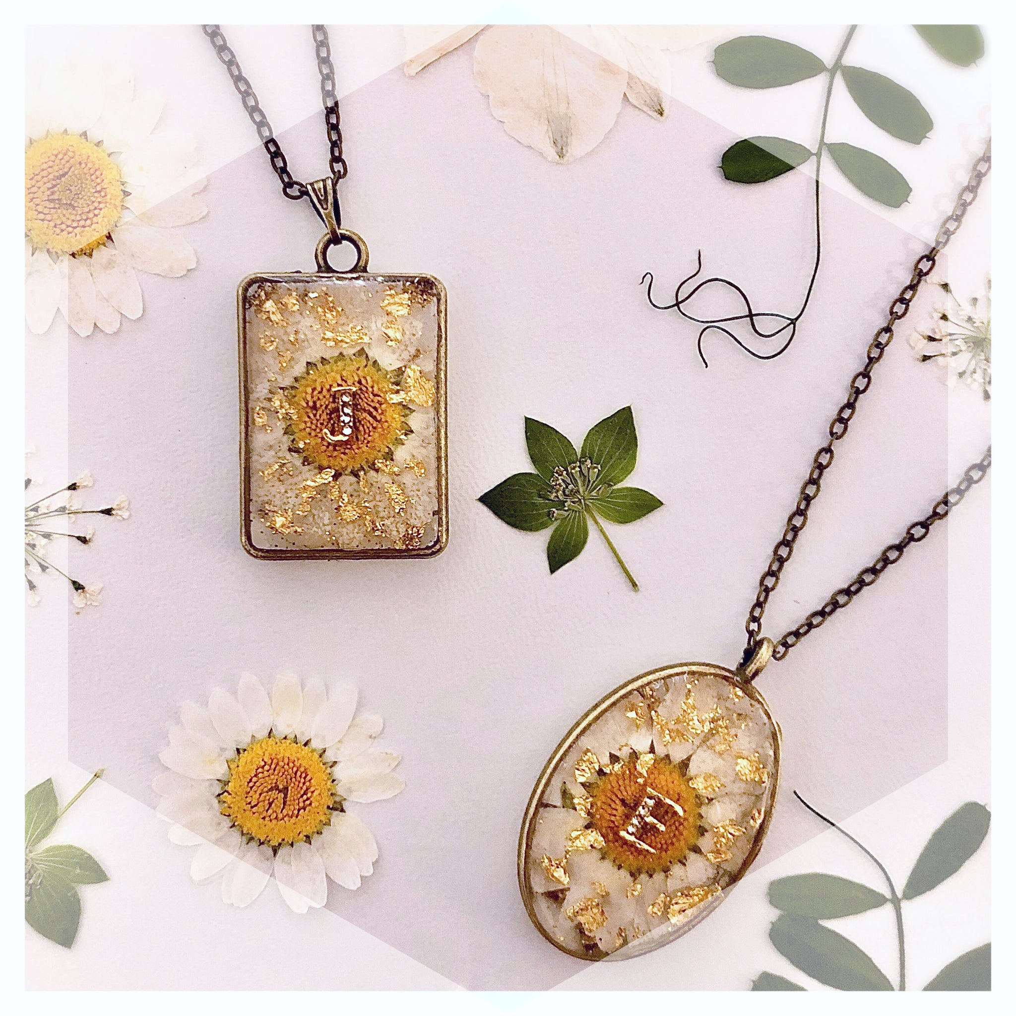 Resin necklace with pressed daisy flower, initial, and gold specks.